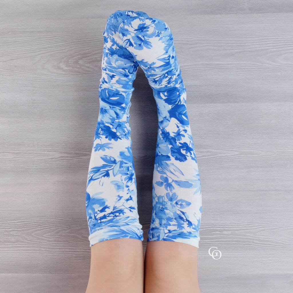 The socks can be made from any knit fabric with at least 25% stretch (a stretch gauge is included in the pattern). This means cotton lycra, French Terry, sweater knit, stretch lace, stretch chiffon, polyblend, rayon spandex etc are all good choices.