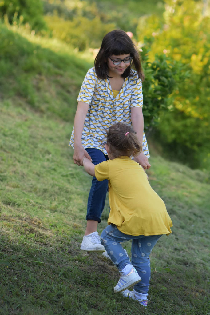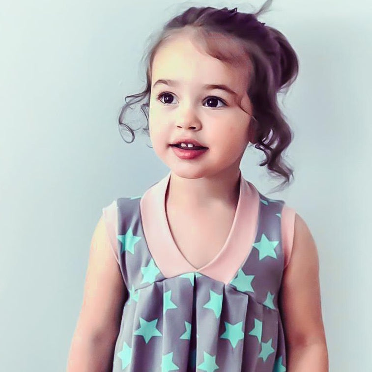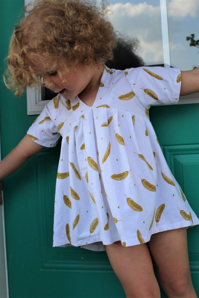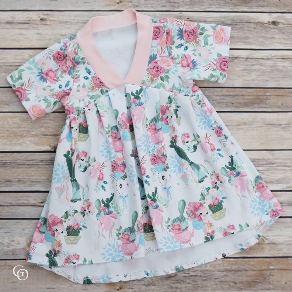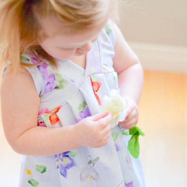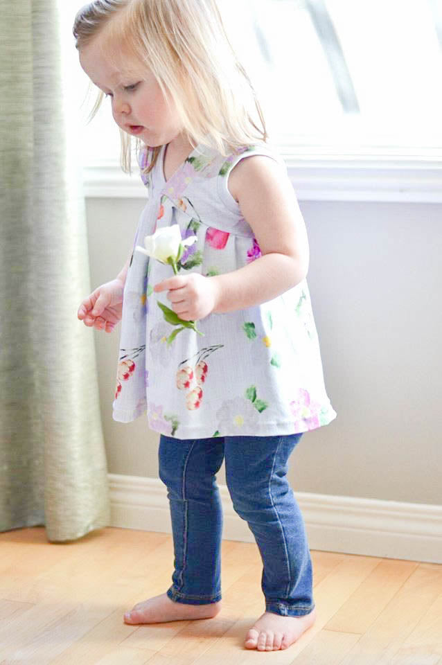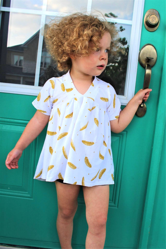 Make a quick but stunning top pattern for your girl with this gorgeous v-neck! Create dimensionality with pleats or simply by gathering the skirt portion. This sweet, summery shirt is bound to be a favorite and has several options! You can add a faux camisole underneath and the pattern comes with shortsleeved and sleeveless option! The top can easily be turned into a dress by adding length to the skirt and back option, and using the sleeves of Abby's Road Trip Tunic, you can quickly add long sleeves to it to turn it into a year-round garment!