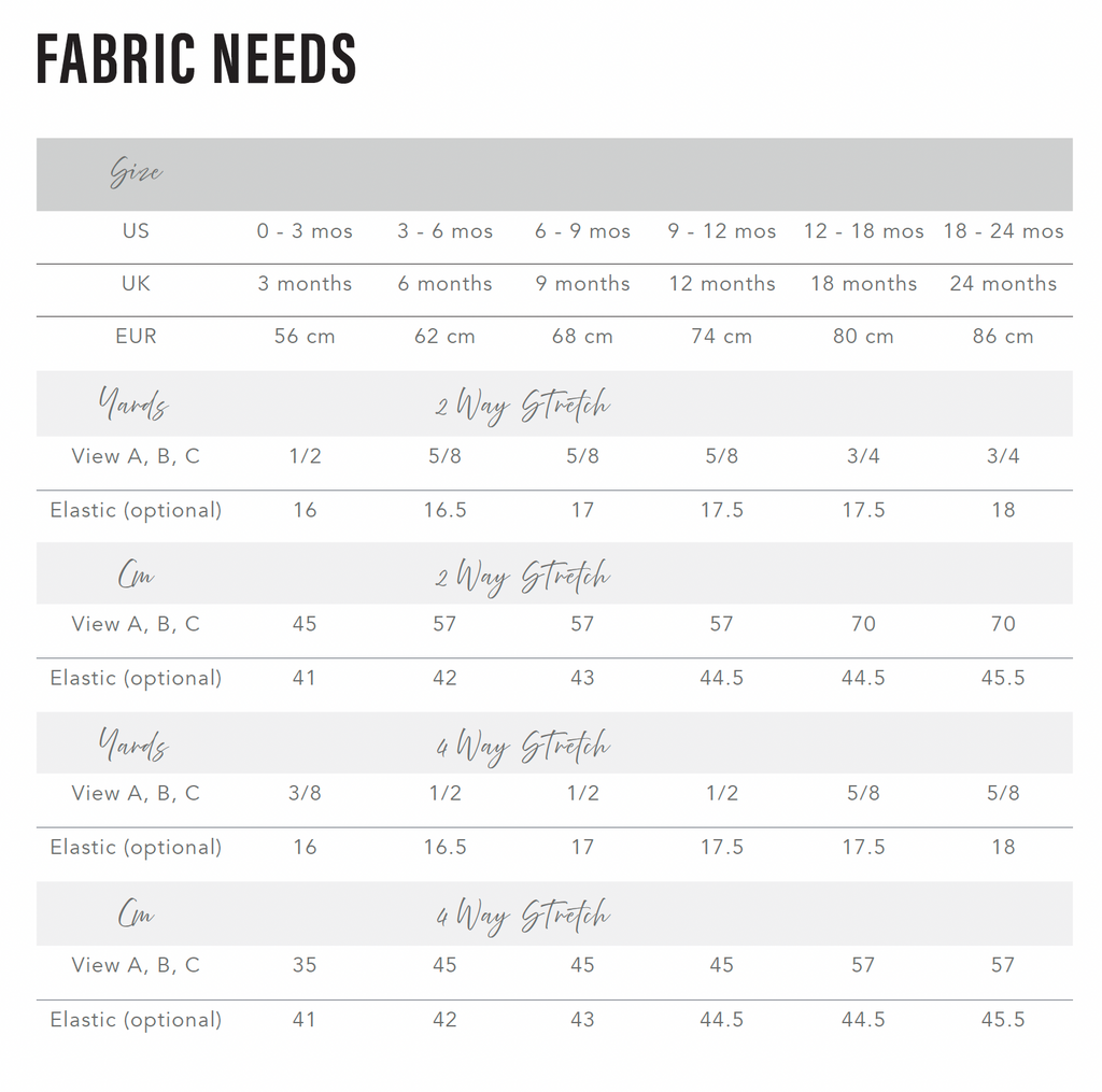 ✽ Options for 2-way (horizontal stretch only) and 4-way (horizontal and vertical stretch) fabrics